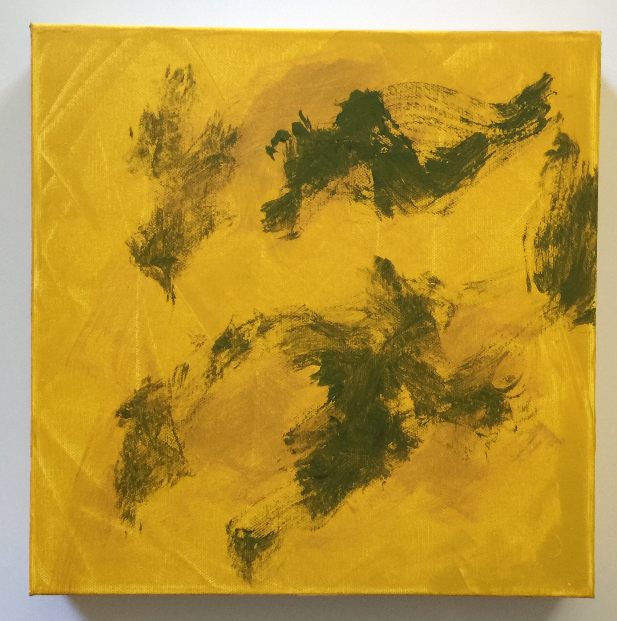 The process of making this painting involved choosing the substrate, a pre-primed commercial canvas 12″ x 12″ x 2″, a size that I like working with and which fits comfortably on my small work table in my small studio. Almost at the same time that I was choosing the canvas I was also deciding on the palette. I knew I wanted a base layer of yellow (Turner’s Yellow, I decided) with an overlay of another shade of yellow (Yellow Oxide). Then I decided on a green for the calligraphic marks that I envisioned making. This green was made by using the base yellow mixed with a bit of ivory black (because it has a blue base to help yellow become green).